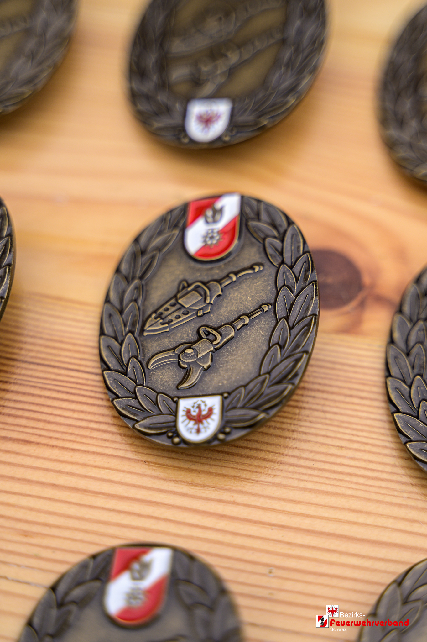 Im Anschluss an die Abzeichenübergabe konnte Bezirksfeuerwehrkommandant Hansjörg Eberharter zwei langjährige Bewerter der Technischen Leistungsprüfung im Namen des Bezirksfeuerwehrverbandes Schwaz mit einer Urkunde für ihren Einsatz ehren: