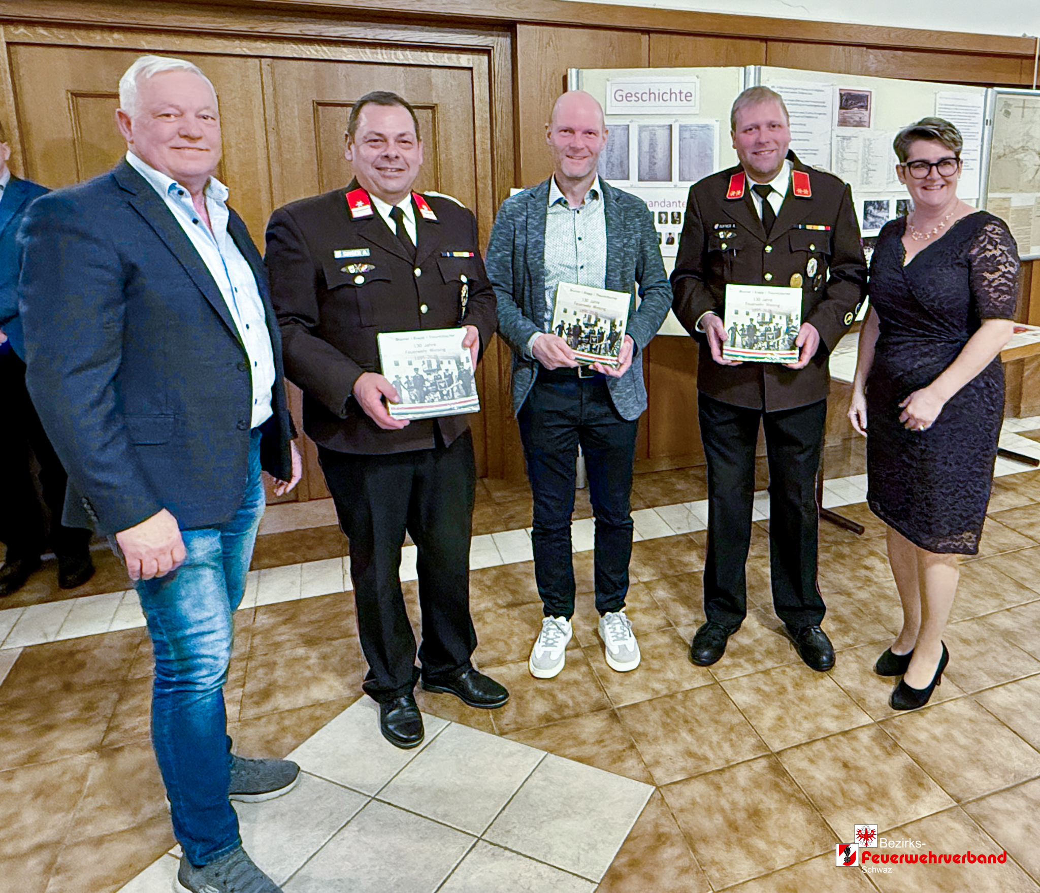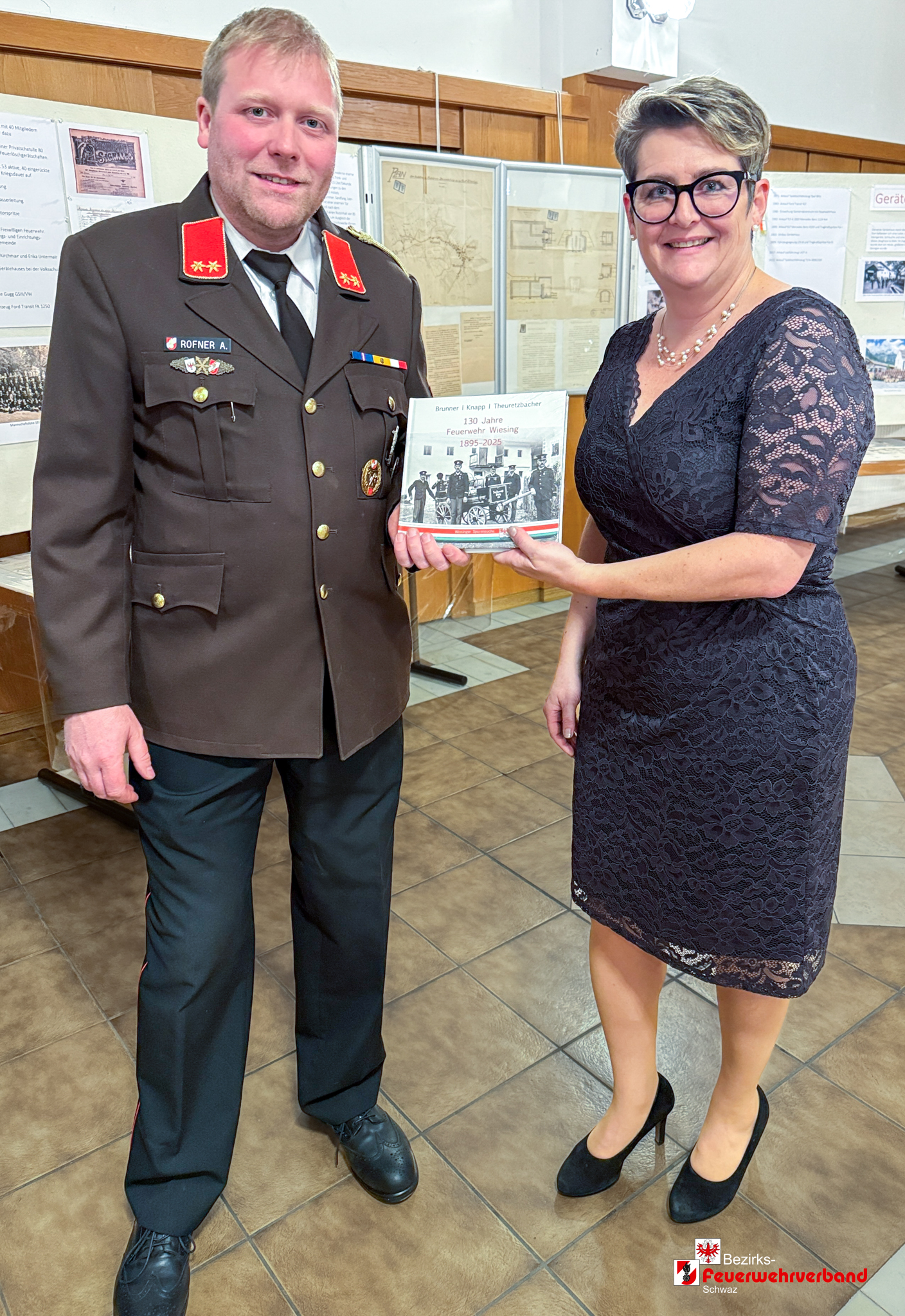 In diesem Rahmen wurde auch das Buch „130 Jahre Feuerwehr Wiesing“ präsentiert. Es bildet ein weiteres Herzstück der Jubiläumsarbeiten und wurde vom Chronistenteam unter der Federführung von Silvia Brunner verfasst. Das Werk stellt eine wertvolle Dokumentation der Geschichte der Feuerwehr Wiesing dar und trägt wesentlich dazu bei, das Wirken und die Tradition unserer Feuerwehr für kommende Generationen zu bewahren. Andreas Rofner, Kommandant der FF Wiesing, und Bürgermeister-Stellvertreter Andreas Singer konnten von Silvia Brunner und Walter Theuretzbacher ein Exemplar der Chronik dankend entgegennehmen.