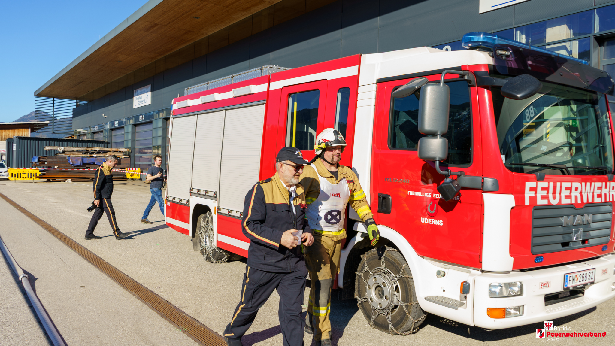 Nach monatelanger Vorbereitung war es für die beiden Gruppen der Feuerwehr Uderns am Freitagnachmittag, 27. Februar 2026, soweit: Sie traten zur Technischen Leistungsprüfung Form B in Bronze an. Das Gelände der Empl Technologie Schmiede in Uderns bot hierfür den passenden Rahmen. Um 14:30 Uhr begann die Prüfung unter der Leitung von FT Ing. Josef Kometer und seinem Bewerterteam. Zu Beginn mussten die Feuerwehrkameraden ihre Gerätekunde unter Beweis stellen. Blind zeigten die Teilnehmer den Bewertern die Beladungsstücke in den Fahrzeugen und durften dabei maximal eine Handbreit abweichen.