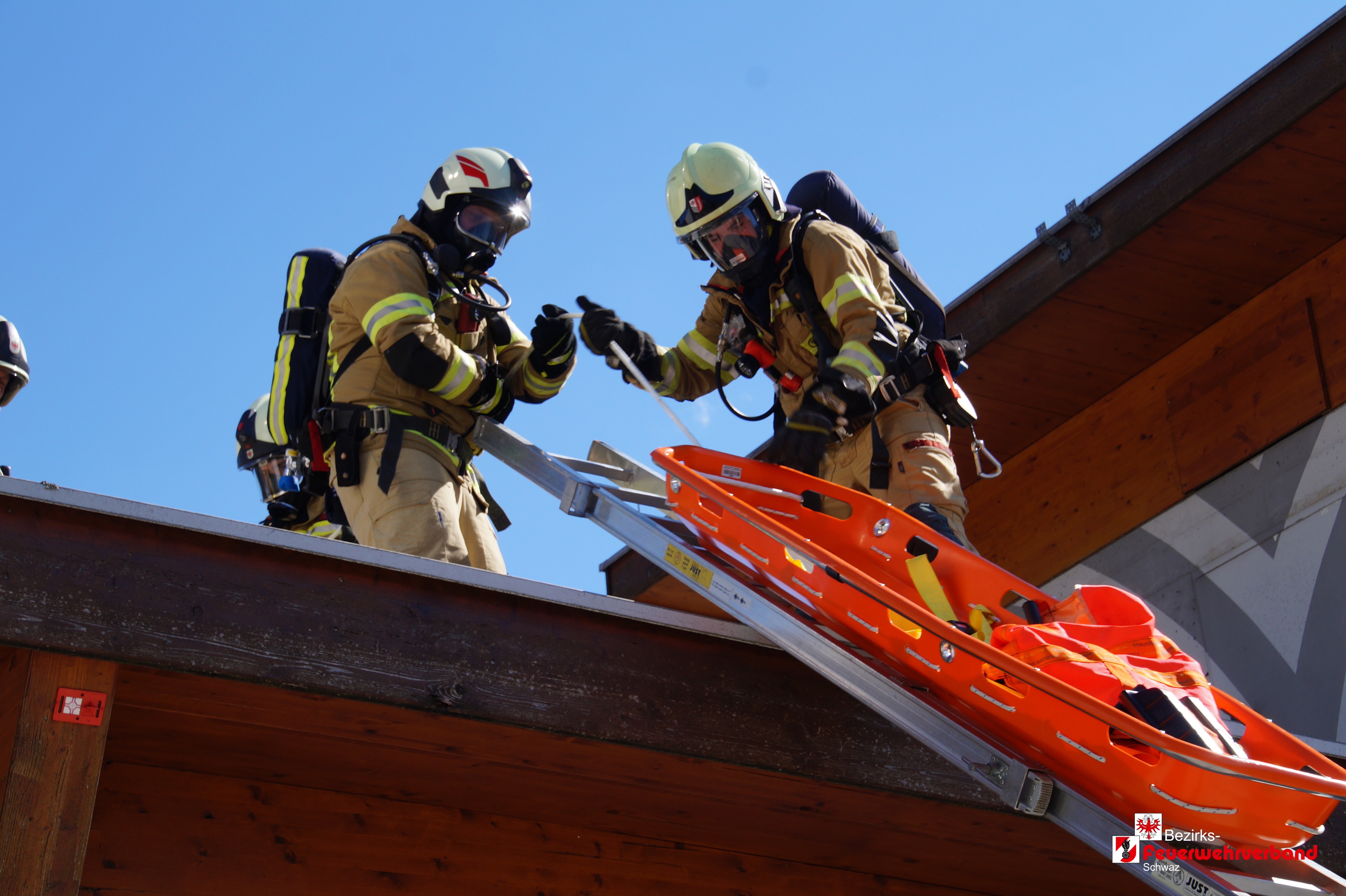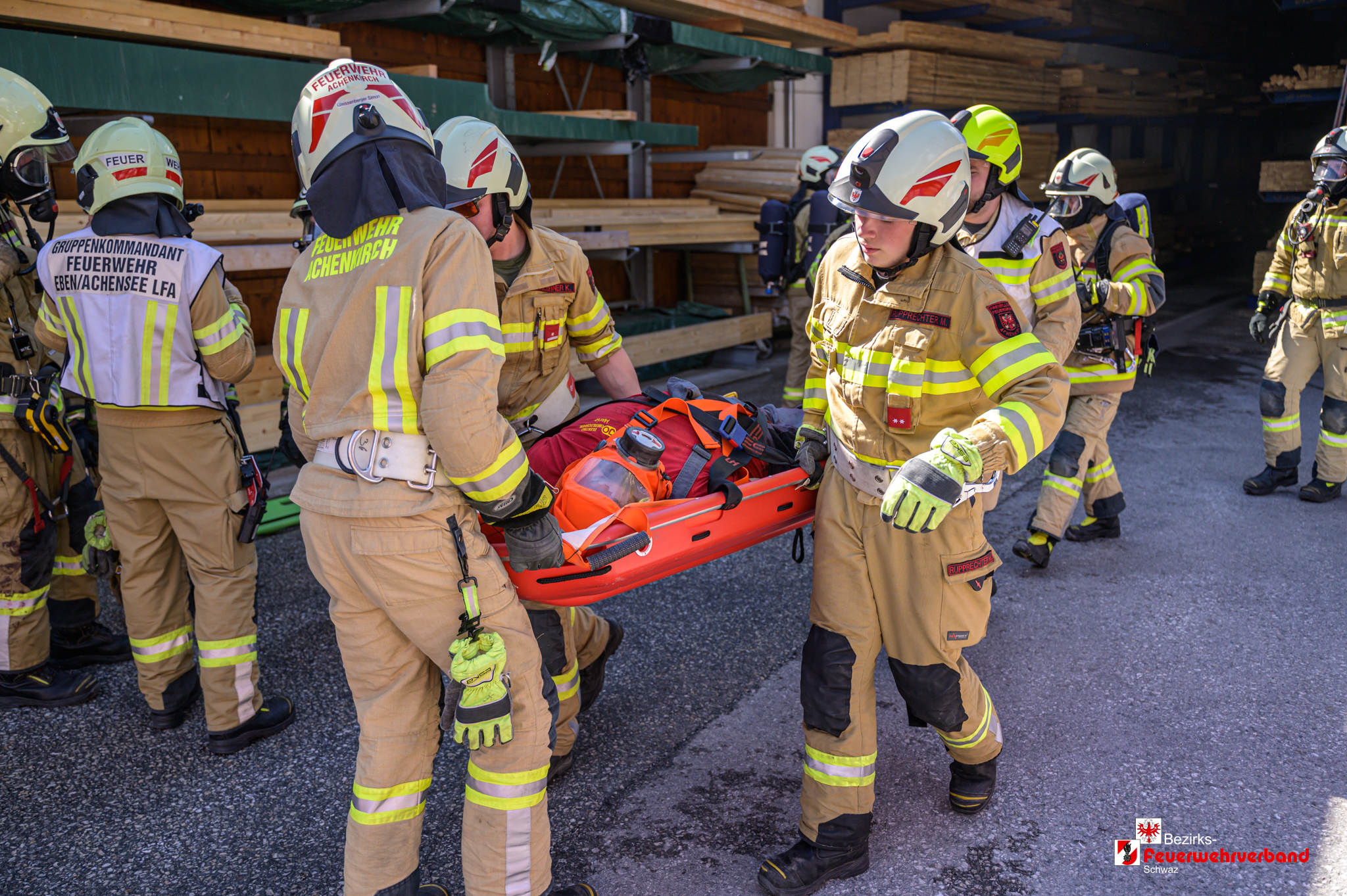 Die Einsatzleitung übernahm der Kommandant der Feuerwehr Eben, Daniel Paulitsch, mit Unterstützung des Abschnittskommandanten Achental, Helmut Künig. Im Fokus stand die Menschenrettung: Mehrere Atemschutztrupps waren im Einsatz, um vermisste Personen in der stark verrauchten Halle zu lokalisieren und zu bergen. So musste unter anderem eine unter einem Stapler eingeklemmte Person schonend befreit werden. Zusätzlich galt es, eine Person aus einer Hackmaschine zu retten sowie eine anspruchsvolle Tiefenbergung durchzuführen. Dafür wurde die Feuerwehr Schwaz mit dem SRF eingesetzt. Darüber hinaus mussten Personen vom Dach eines Spänesilos gerettet sowie eine weitere Person aus exponierter Lage geborgen werden. Unterstützung erhielten die Einsatzkräfte dabei von der Feuerwehr Jenbach mit der Teleskopmastbühne. Diese Aufgaben erforderten präzises Arbeiten und ein hohes Maß an Abstimmung zwischen den eingesetzten Kräften.
