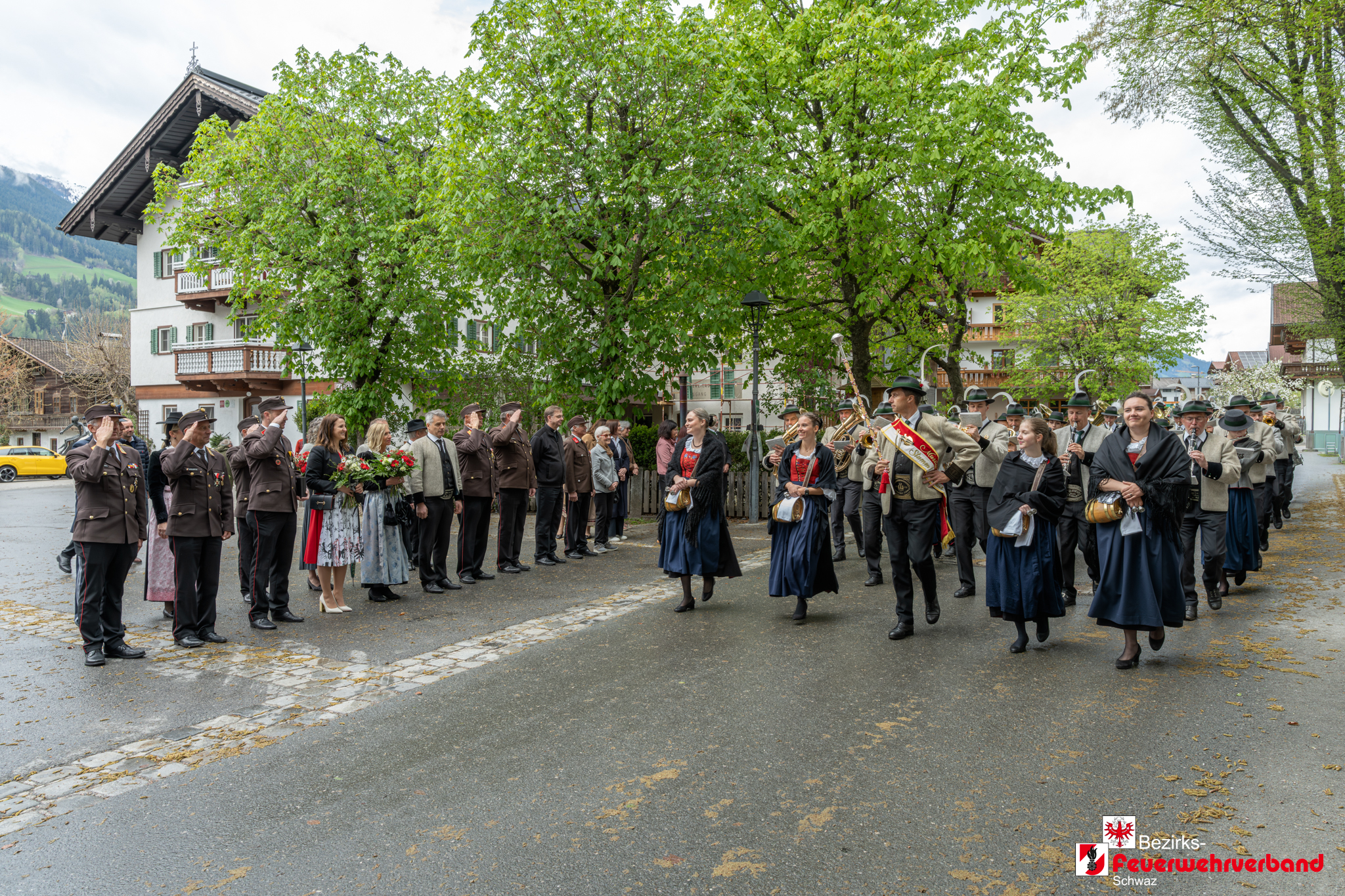 Den feierlichen Abschluss bildete die Defilierung am Stummer Dorfplatz. Danach klang die Veranstaltung bei einer gemeinsamen Verköstigung im Gasthof Pinzger in kameradschaftlicher Atmosphäre aus.