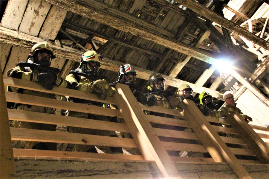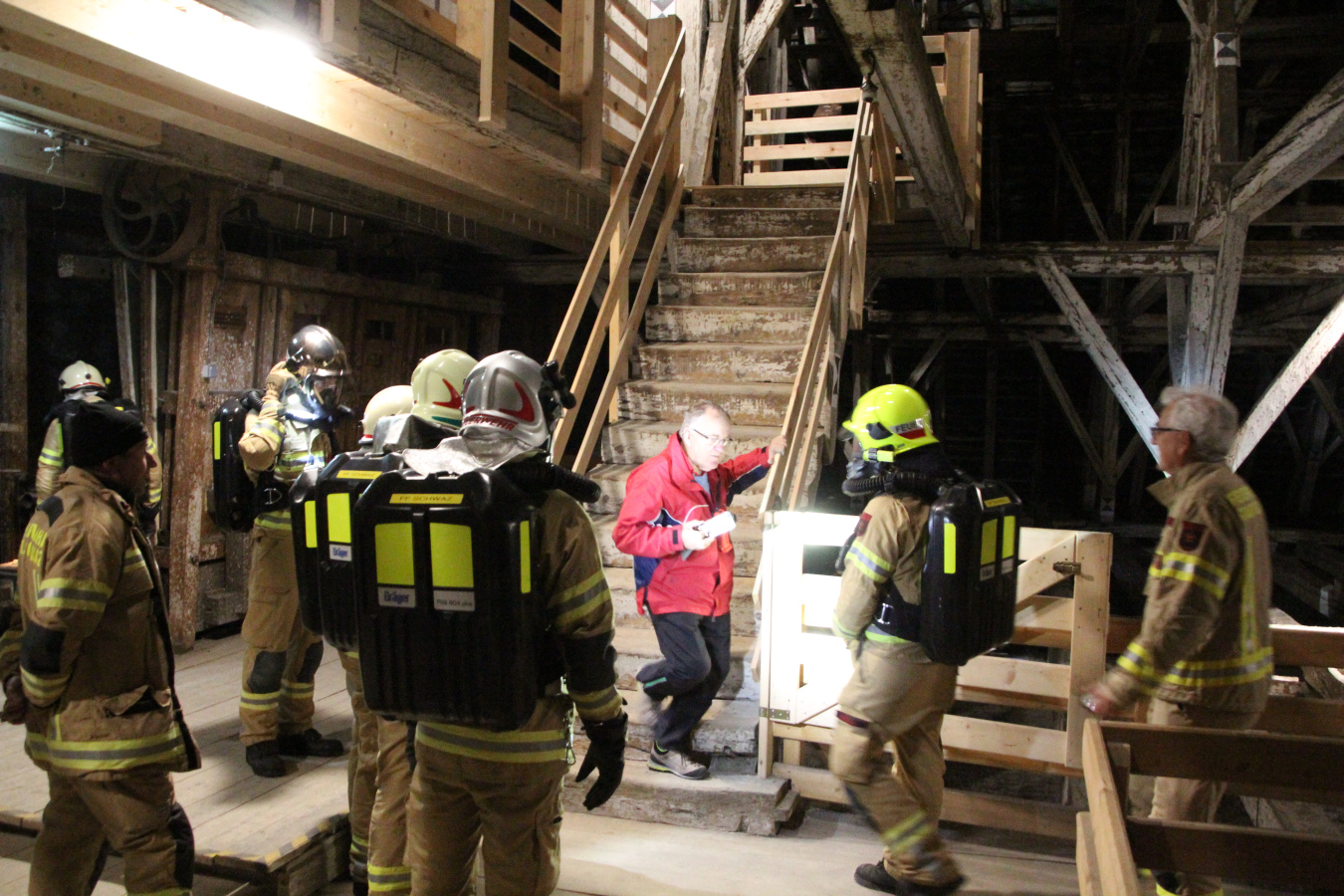Im Gerätehaus wurde zunächst das Gerät ausgefasst und in Betrieb genommen, ehe es per Fahrzeug in Richtung Innenstadt ging. Als Übungsobjekt hatte man sich diesmal etwas nicht Alltägliches ausgesucht - die Stadtpfarrkirche von Schwaz, wo bereits Feuerwehrkurat Mag. Martin Müller wartete. Nach einer kurzen Einweisung öffnete sich die Tür zum Glockenturm, dessen Spitze das erste Ziel der Übung sein sollte. Im Laufe der Jahre geriet der Turm durch die Belastung der schweren Glocken in Schieflage, daher entschied man sich Anfang der 1900er Jahre, nördlich des Kirchparks einen neuen Glockenturm zu errichten und die Glocken umzusiedeln. Über Stufen und Steige im Inneren des Turmes ging es hinauf in 40 Meter Höhe, von wo man einen einmaligen Blick über die Stadt und das Inntal hat. Oben angekommen erzählte Martin einige Details zur Pfarre, und auch keine der etlichen Fragen blieb unbeantwortet, ehe es wieder nach Unten ging. Nach einer kurzen Verschnaufpause führte der Weg durch das Innere der Kirche hinauf in den imposanten Dachstuhl, welcher vor Kurzem erst so adaptiert wurde, dass er der Öffentlichkeit zugänglich ist. Anschließend spazierten die beiden Trupps noch durch das Stadtgebiet ins Gerätehaus Schwaz, wo im Keller noch eine kleine Feinmotorikübung zu absolvieren war, ehe sie die Geräte ablegen und wieder frische Luft atmen durften.