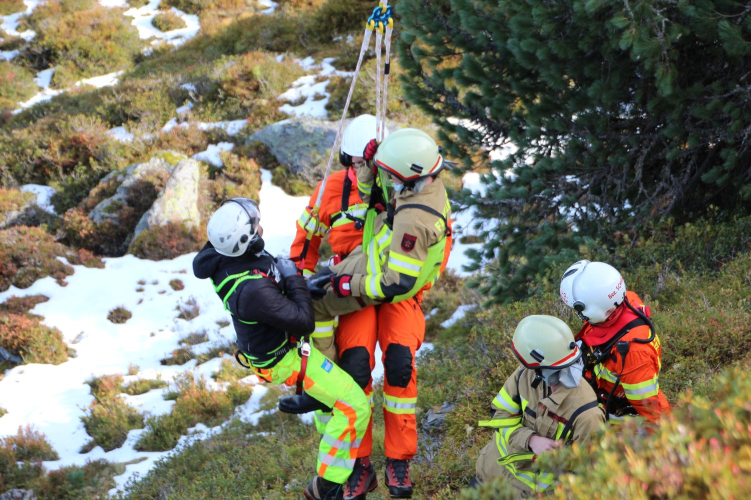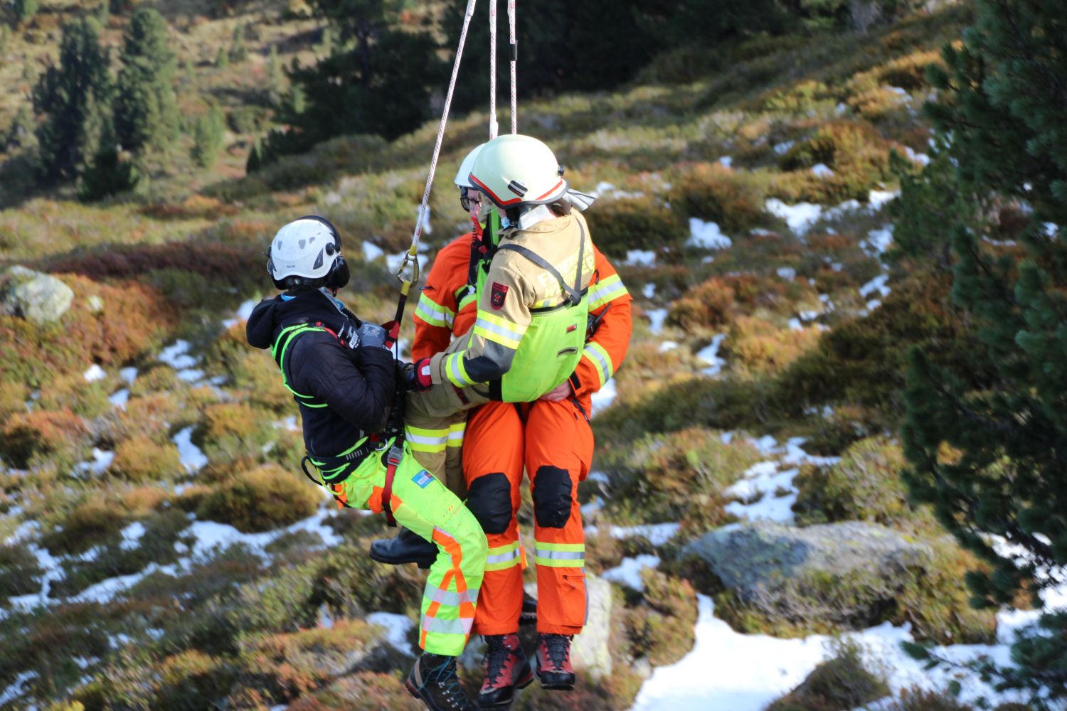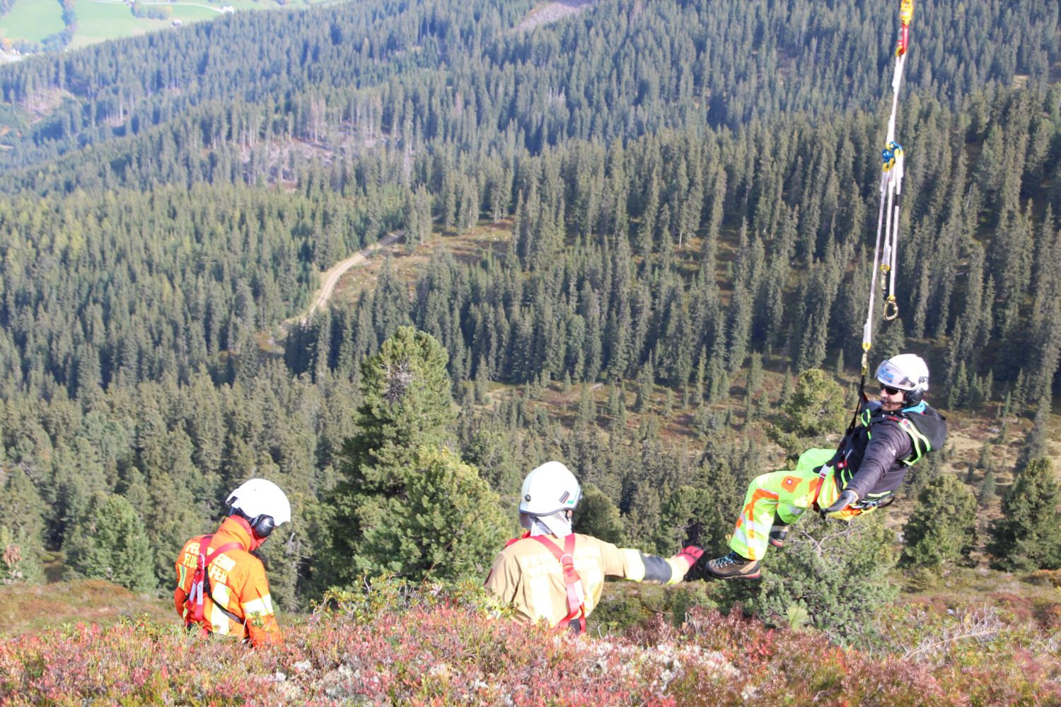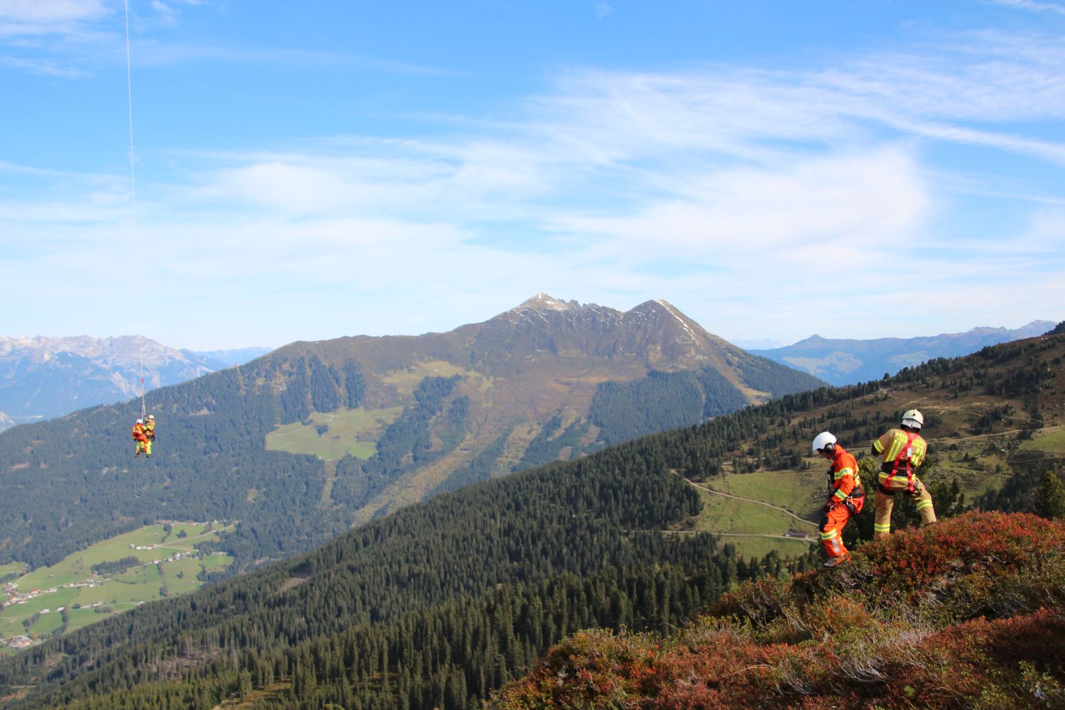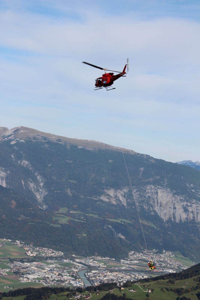 Weiter ging es im Programm mit dem Transport von Mannschaft am Tau des Hubschraubers. Diese Methode wird angewandt, wenn im exponierten Gelände ein Absetzen aus der Kabine heraus nicht möglich ist. Dafür wurden wieder im Rotationsprinzip Mannschaften abwechselnd zu zwei Absetzpunkten ins Gelände geflogen – bis hinauf zum Nonsjöchl auf 2.028 Meter Seehöhe. Oberste Priorität dabei immer Sicherheit: bei jedem Flug waren immer zwei Flughelfer sowie ein Mannschaftsmitglied am Tau.
