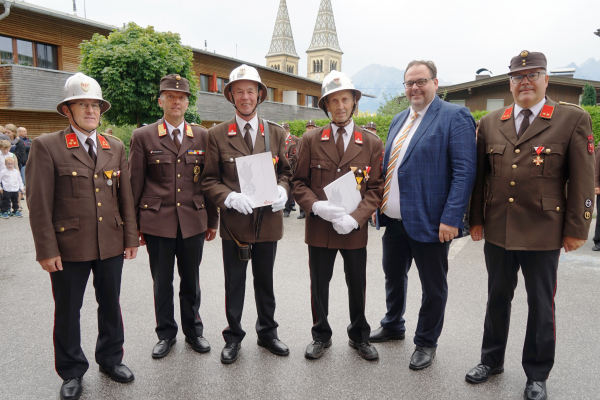 Nach der Heiligen Messe fanden die Beförderungen und Ehrungen verdienter Mitglieder sowie die Angelobung der Jungfeuerwehrmänner statt. Eine besondere Auszeichnung erhielten die Cousins Franz und Johann Schiffmann. Ihnen wurde das Verdienstzeichen des Bezirksfeuerwehrverbandes Schwaz in Bronze überreicht. Die Feuerwehr Weerberg hat im Jahr 1980 eine Feuerwehrfahne bekommen. Seit damals sind die beiden als Fähnrich bzw. Fahnenbegleiter für die Feuerwehr Weerberg tätig. In seiner Ansprache bedankte sich Bezirks-Feuerwehrkommandant Stv. BR Hansjörg Eberharter bei Franz und Johann und betonte, dass es im Bezirk Schwaz einzigartig ist, dass die Funktion des Fähnrichs bzw. Fahnenbegleiters mehr als 40 Jahre ausgeübt wird. Die Feuerwehr Weerberg gratuliert allen beförderten und geehrten Kameraden.