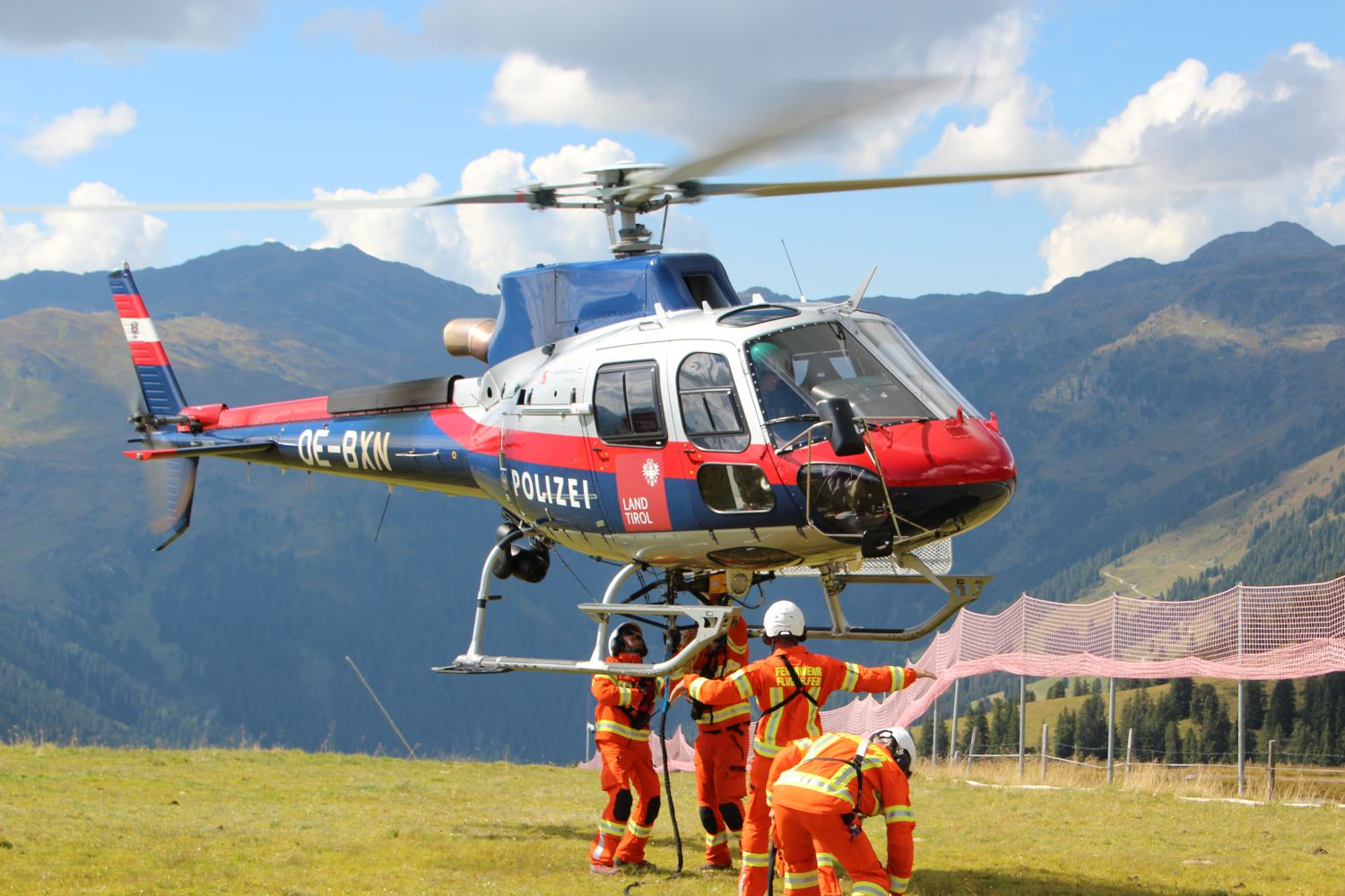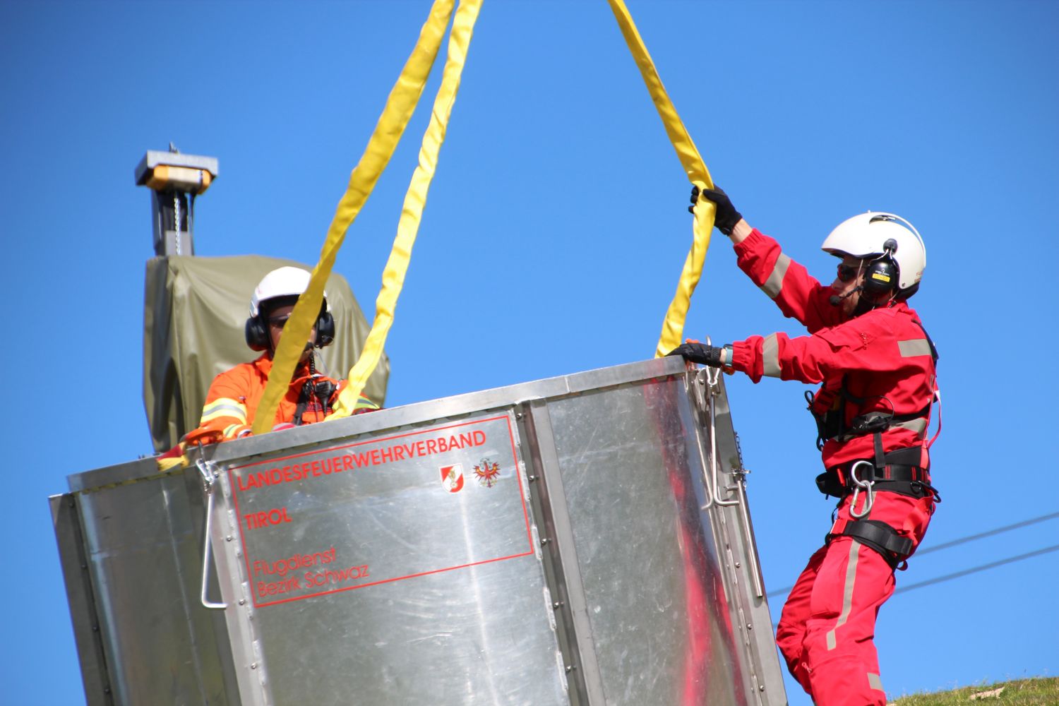 Am Vormittag standen Transportflüge mit verschiedenstem Flugdienst-Gerät auf dem Plan. Dabei kamen auch eine Arbeitsplattform für steiles Gelände des BFV Imst sowie ein neuer Wasserbehälter für die Bodenbrandbekämpfung mit 270l Fassungsvermögen zum Einsatz. Vom Absprungplatz aus wurden zwei Übungspunkte knapp unterhalb des Gipfels bedient. Hauptaugenmerk waren hier das Einweisen des Piloten, das Aus- und Einhängen der verschiedenen Geräte sowie die Koordination der Flugbewegungen. Die Fliegerische Einsatzleitung war hier besonders gefordert, denn es galt Leerflüge möglichst zu vermeiden.