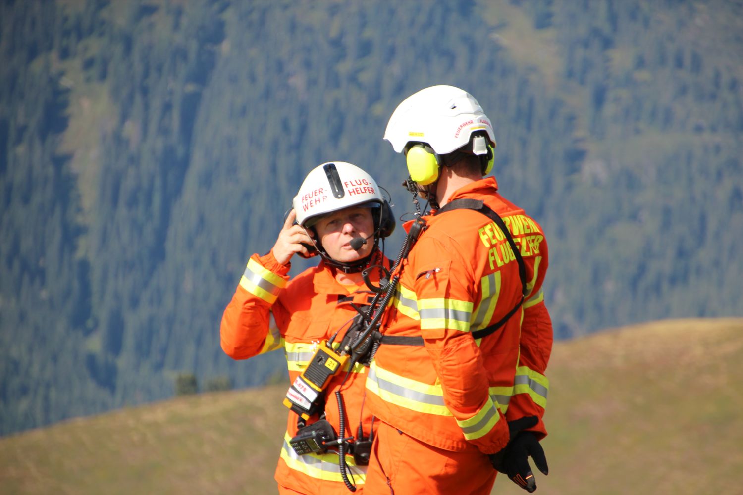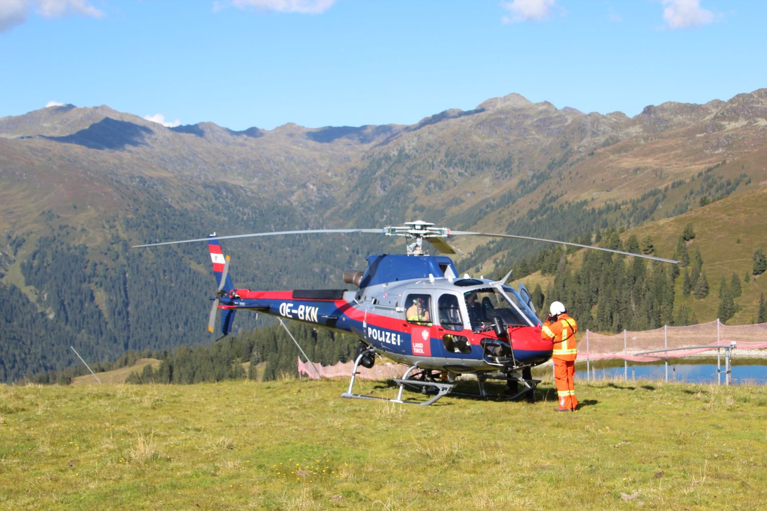 Zunächst wurden alle Geräte entladen und vorbereitet, ehe um 09:45 Uhr mit etwas Verspätung der Landeshubschrauber eintraf. Bei einer kurzen Besprechung, der auch die Bezirkskommandanten Jakob Unterladstätter und Hansjörg Eberharter beiwohnten, stelle Sachgebietsleiter Stefan Rinnergschwentner den Ablauf für die nächsten Stunden vor.
