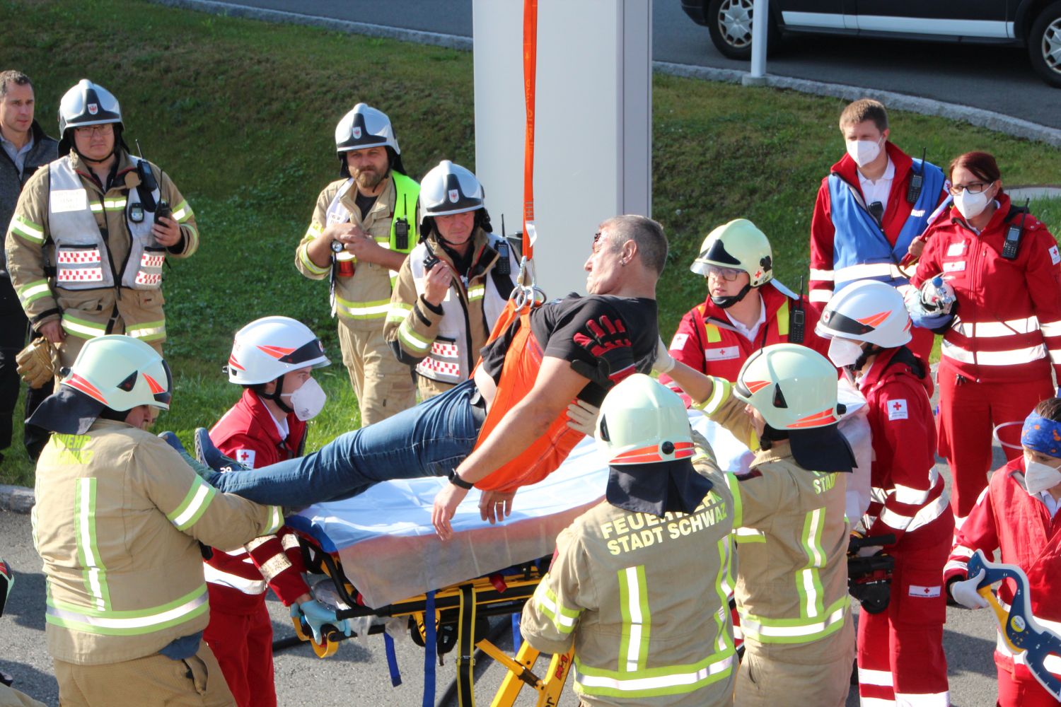 Zur Sicherheit wurden alle Teilnehmer gebeten, vorher einen Covid-Test durchzuführen, um das Risiko zu minimieren. Das Vorbereitungsteam um Hannes Jäger und Patrick Laufenböck hat sich einen Monat lang für diesen Tag einiges überlegt. So standen am Vormittag mehrere verschiedene Übungen auf dem Plan, die von zwei Gruppen im Wechsel abgearbeitet werden mussten. Vom Verkehrsunfall mit Fahrzeugbrand über Brandmeldealarme bis hin zur technischen Menschenrettung war alles dabei und stellte die Einsatzleiter gelegentlich vor die eine oder andere Herausforderung. Stets begleitet wurden die Einsatzgruppen vom Roten Kreuz, welches die Versorgung der Patienten übernahm. Auch die Einsatzmittel der Feuerwehr sind irgendwann erschöpft und so unterstützte die Bergrettung, die für solche Einsätze bestens ausgerüstet ist, bei der Rettung eines Patienten von einem Baukran.