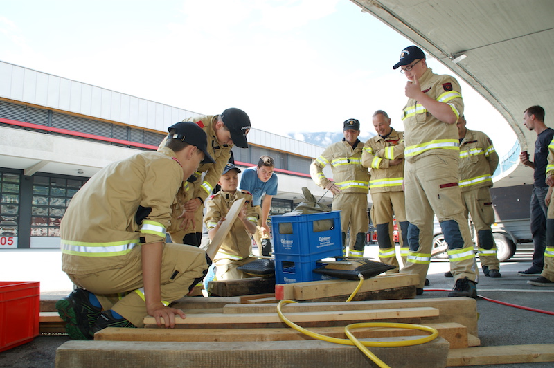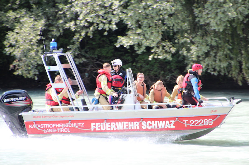 Um die 80 Jugendliche waren der Einladung gefolgt und zum Einsatzzentrum nach Schwaz gekommen. Um die Wartezeit zu verkürzen, hatten sich die Kameraden der Schwazer Wehr ein tolles Rahmenprogramm ausgedacht. Angefangen mit einem Geschicklichkeitsspiel mit den Hebekissen, Klettern in der Kletterhalle über Fahrten mit der Drehleiter bis hin zu Führungen durch die Räumlichkeiten. Ein tolles Programm, ehe es dann endlich zum Bootshaus ging, um dort mit dem neuen Einsatzboot der Feuerwehr Schwaz eine Runde auf dem Inn zu drehen. Die Begeisterung der Kids war natürlich dementsprechend groß. Den krönenden Abschluss eines spannenden Tages in Schwaz bildete eine gemeinsame Grillfeier auf der Terrasse, wo auch Alt-BFK Johann Steinberger es sich nicht nehmen ließ, gemeinsam mit den Kameraden aus Schwaz den Pfannenwender zu schwingen und die Gäste zu verköstigen.