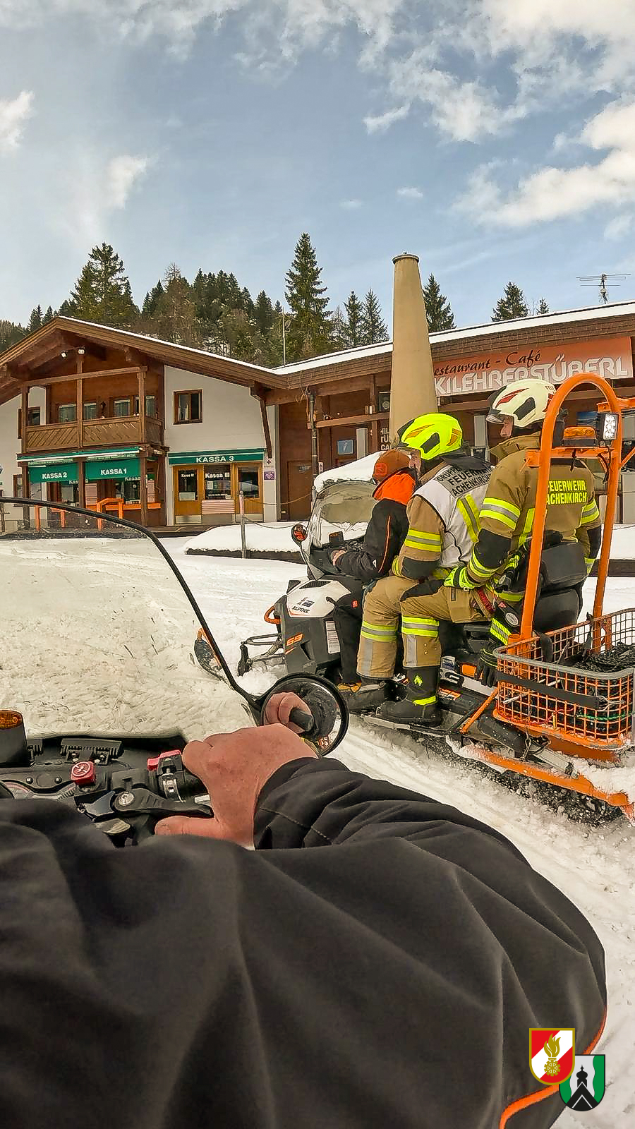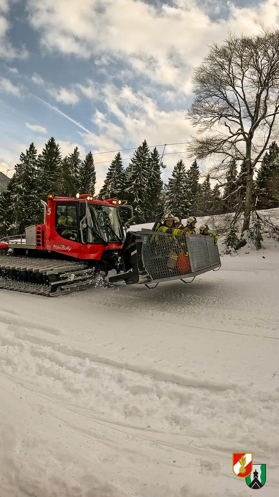 Die Alarmierung erfolgte um 15:02 Uhr. Direkt nach Übungsalarmierung erfolgte eine telefonische Abstimmung zwischen Einsatzleiter und Betriebsleiter, wodurch die benötigten Transportmittel frühzeitig organisiert werden konnten. Beim Eintreffen unseres Tanklöschfahrzeugs standen aufgrund der vorangegangenen Abstimmung bereits zwei Pistenraupen – darunter eine Transportmaschine – sowie drei Skidoos bei der Talstation bereit. Dadurch konnten der erste Atemschutztrupp sowie der Einsatzleiter rasch zur Bergstation transportiert werden.
