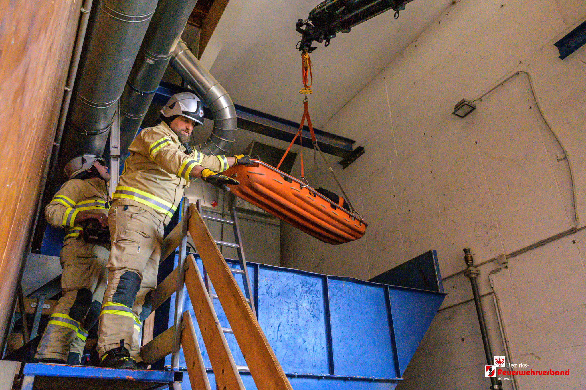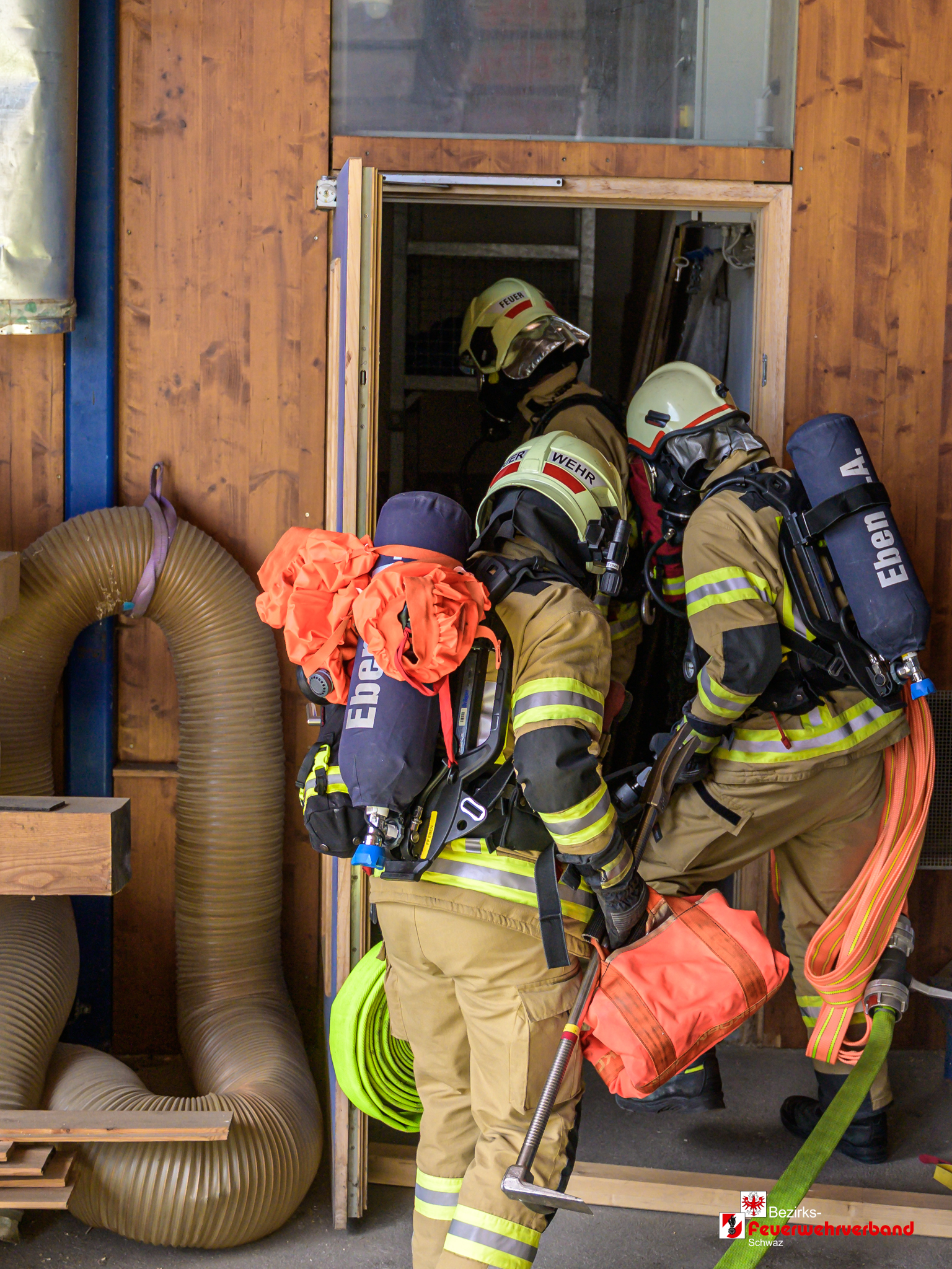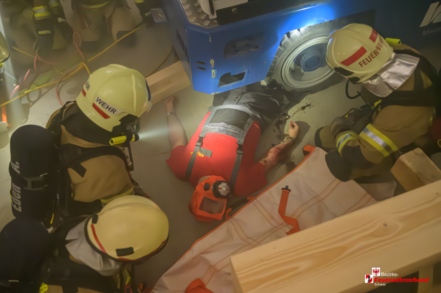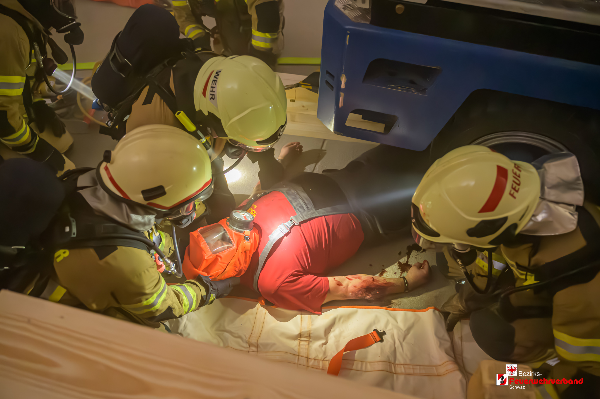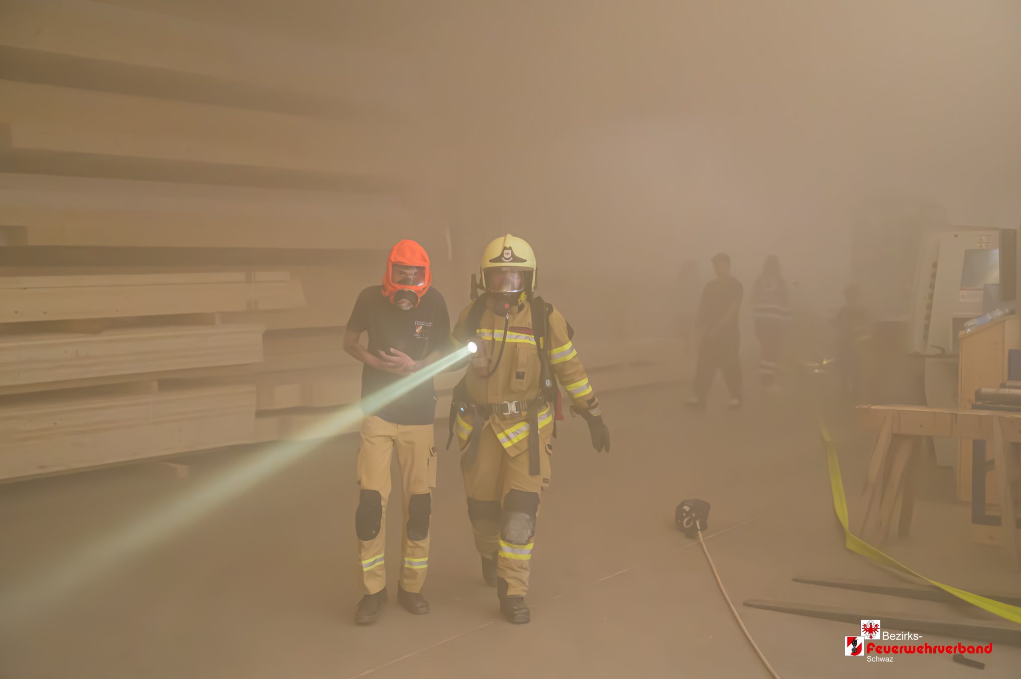 Die Einsatzleitung übernahm der Kommandant der Feuerwehr Eben, Daniel Paulitsch, mit Unterstützung des Abschnittskommandanten Achental, Helmut Künig. Im Fokus stand die Menschenrettung: Mehrere Atemschutztrupps waren im Einsatz, um vermisste Personen in der stark verrauchten Halle zu lokalisieren und zu bergen. So musste unter anderem eine unter einem Stapler eingeklemmte Person schonend befreit werden. Zusätzlich galt es, eine Person aus einer Hackmaschine zu retten sowie eine anspruchsvolle Tiefenbergung durchzuführen. Dafür wurde die Feuerwehr Schwaz mit dem SRF eingesetzt. Darüber hinaus mussten Personen vom Dach eines Spänesilos gerettet sowie eine weitere Person aus exponierter Lage geborgen werden. Unterstützung erhielten die Einsatzkräfte dabei von der Feuerwehr Jenbach mit der Teleskopmastbühne. Diese Aufgaben erforderten präzises Arbeiten und ein hohes Maß an Abstimmung zwischen den eingesetzten Kräften.
