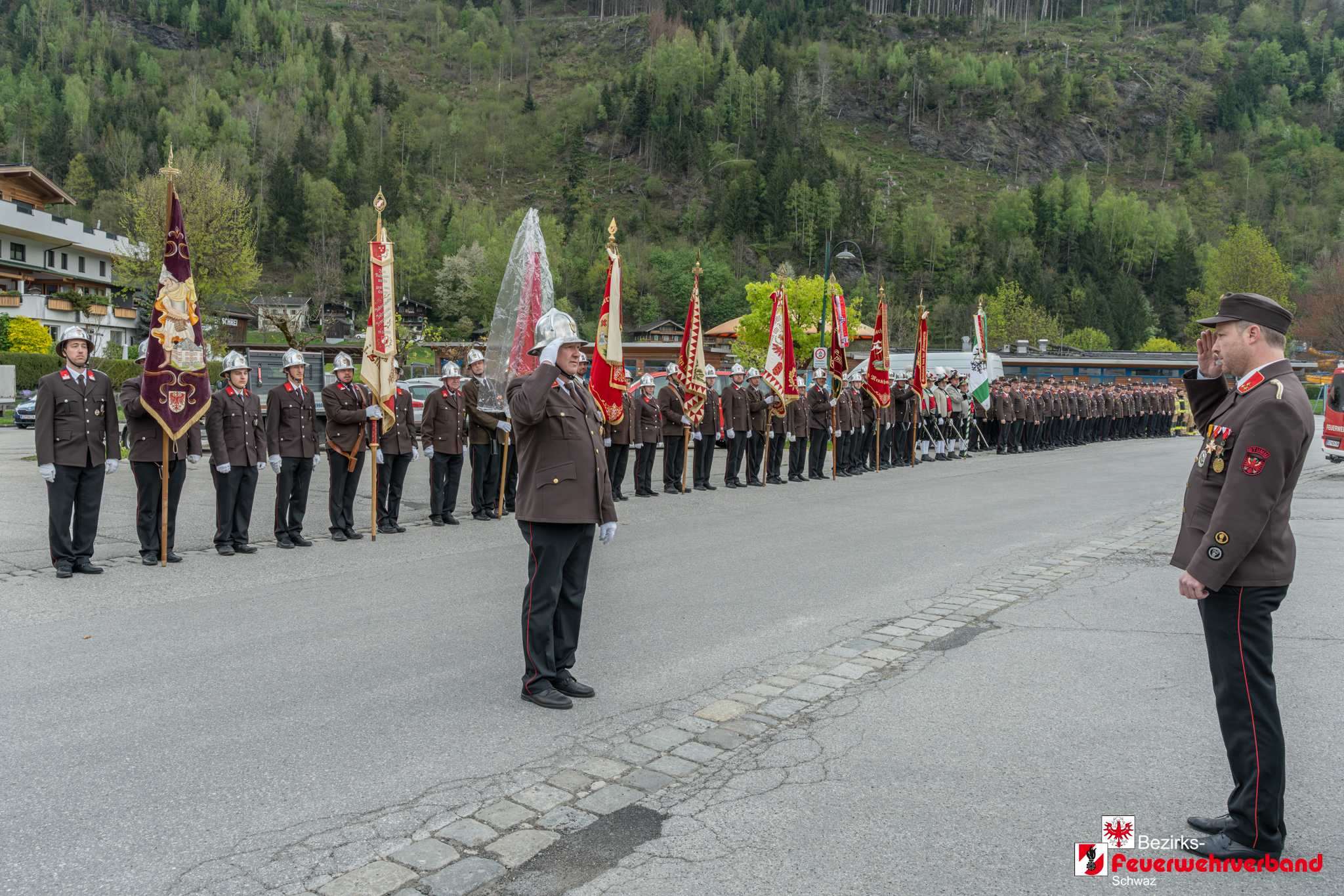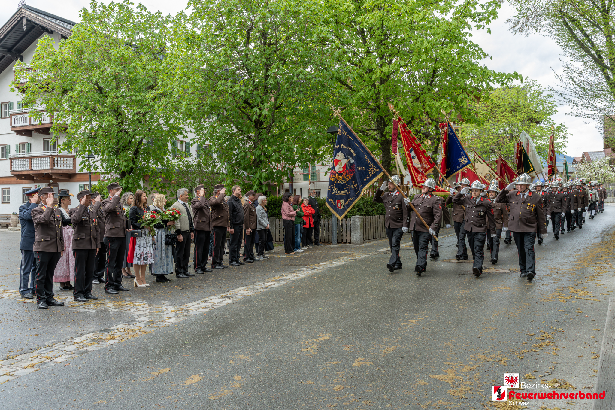 Den feierlichen Abschluss bildete die Defilierung am Stummer Dorfplatz. Danach klang die Veranstaltung bei einer gemeinsamen Verköstigung im Gasthof Pinzger in kameradschaftlicher Atmosphäre aus.